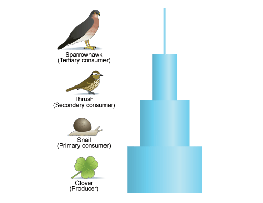 Energy is lost to the surroundings as we go from one level to the next, so there are fewer organisms at each level in this food chain. A lot of clover is needed to support the snail population. A thrush eats lots of snails, and a hawk eats lots of thrushes, so the population of hawks is very small.